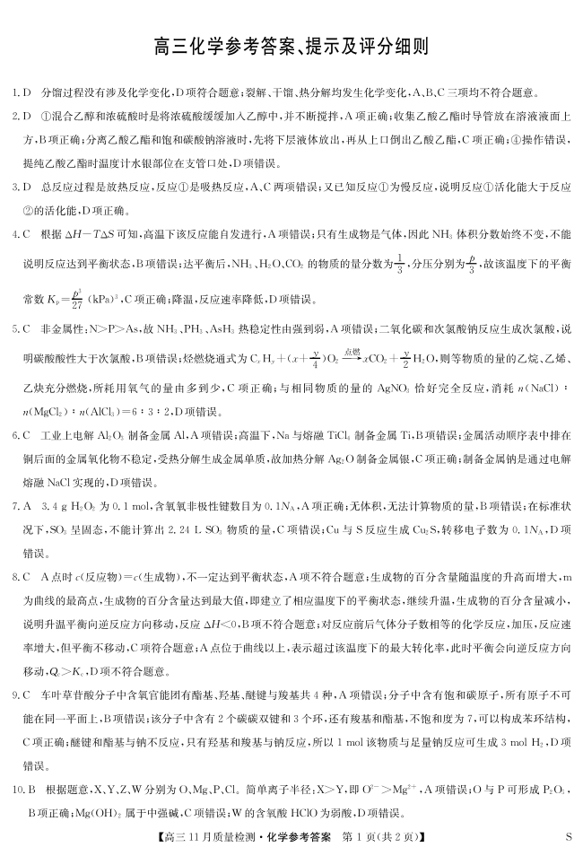 河南省区域高中2025届高三年级11月质量检测(九师联盟)化学答案