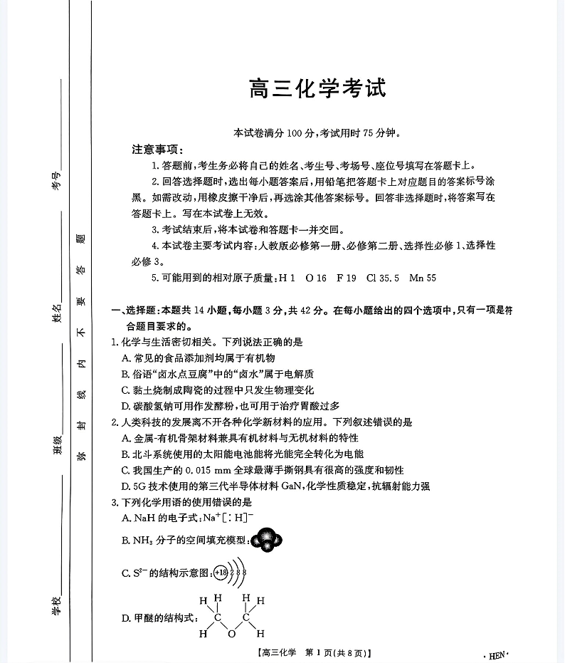 河南省驻马店市2024.11高三年级上学期期中考试化学