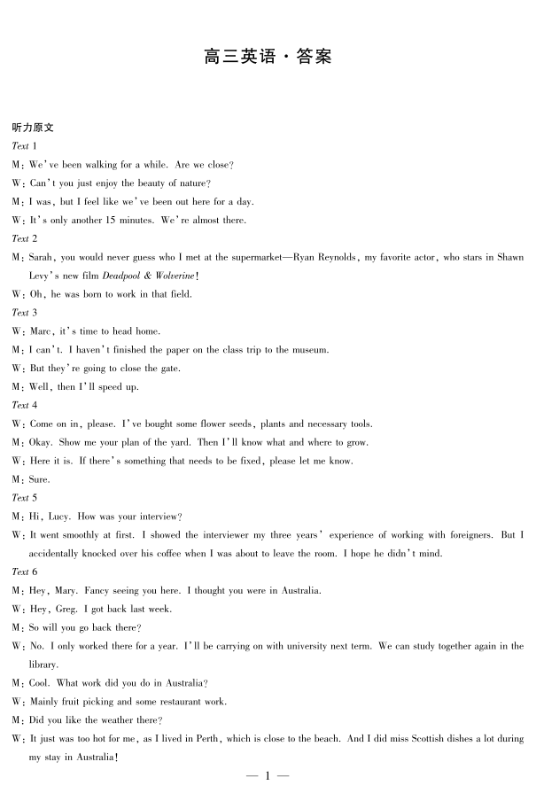 湖南省湘一名校联盟2025届高三11月联考联评英语答案