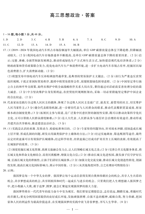 湖南省湘一名校联盟2025届高三11月联考联评政治答案