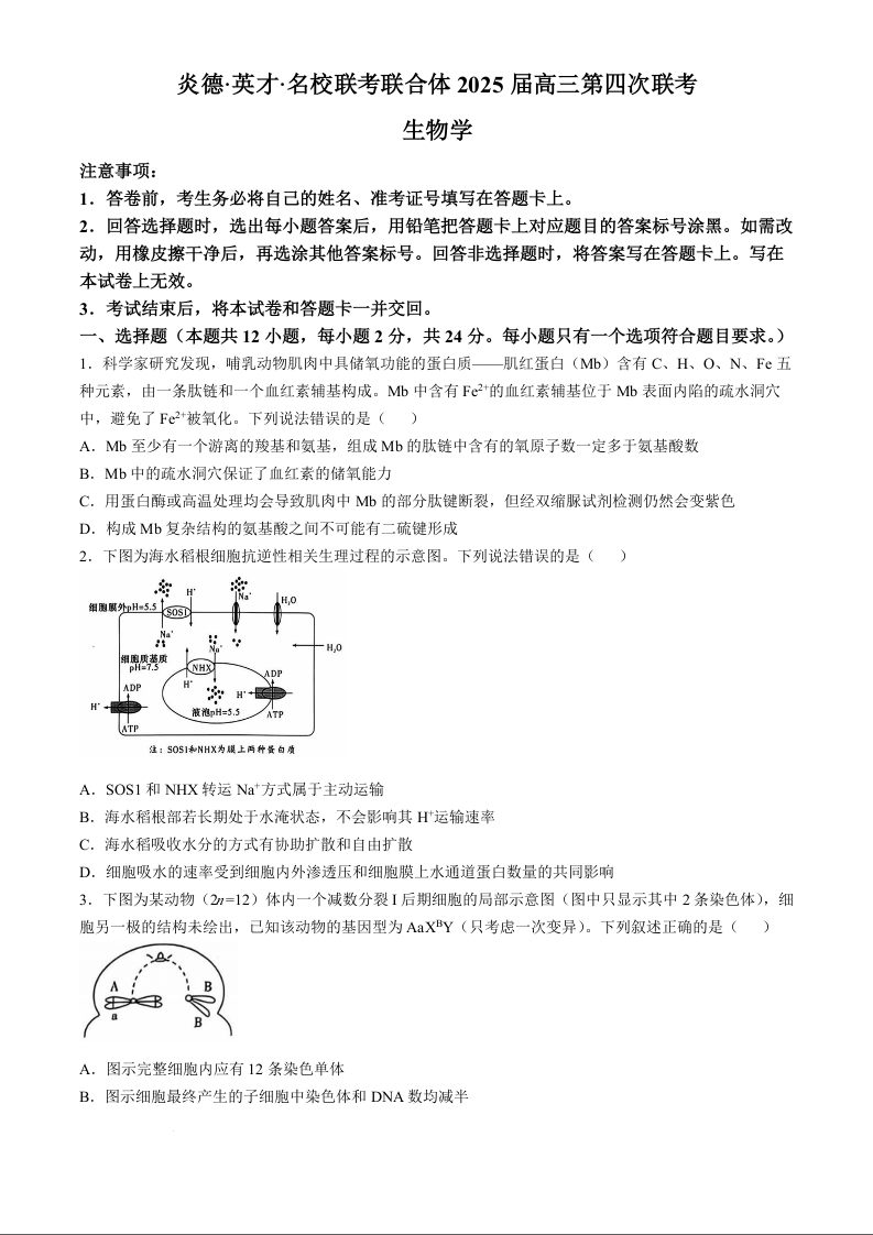 湖南省炎德英才名校联考联合体2025届高三第四次联考生物+答案