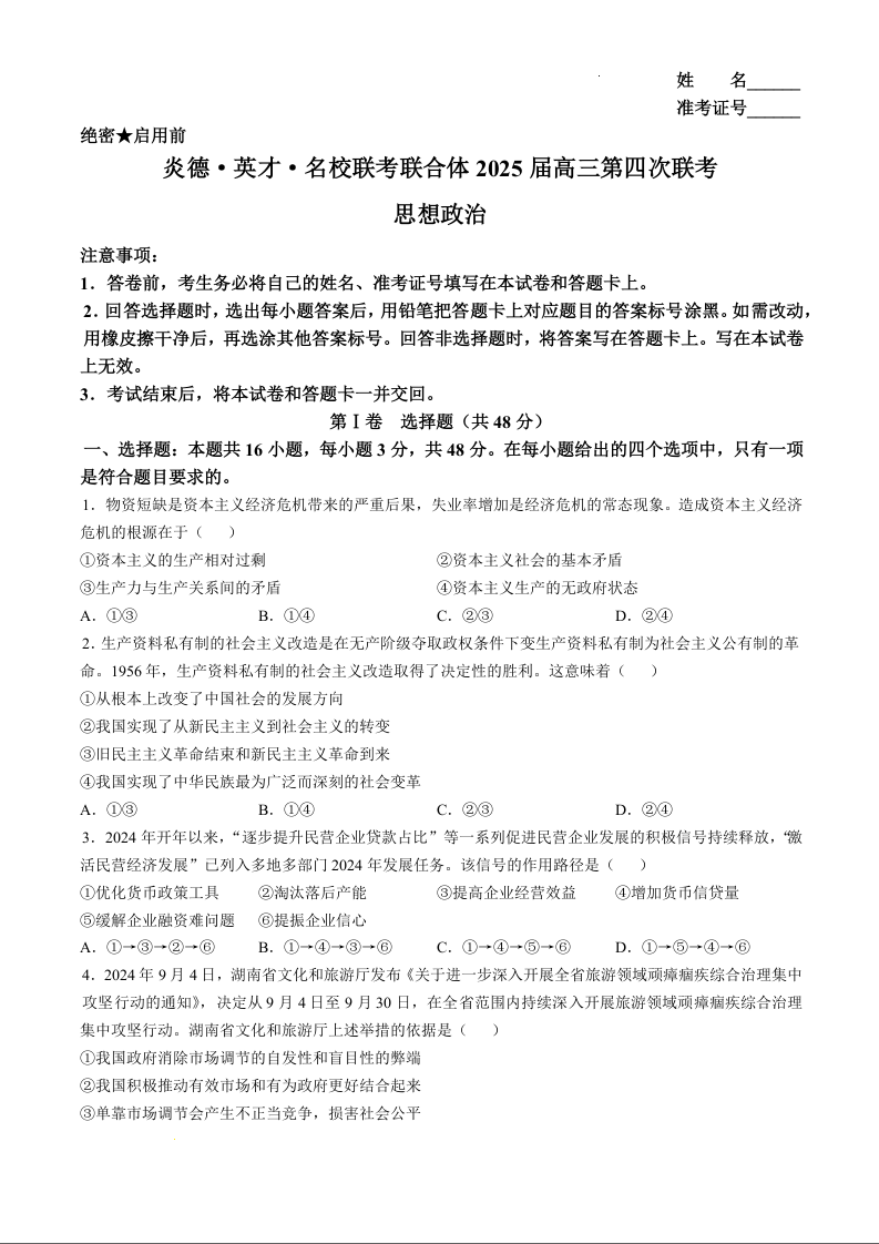 湖南省炎德英才名校联考联合体2025届高三第四次联考政治+答案