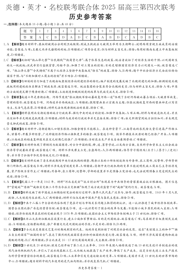 湖南省炎德英才名校联考联合体2025届高三第四次联考历史答案