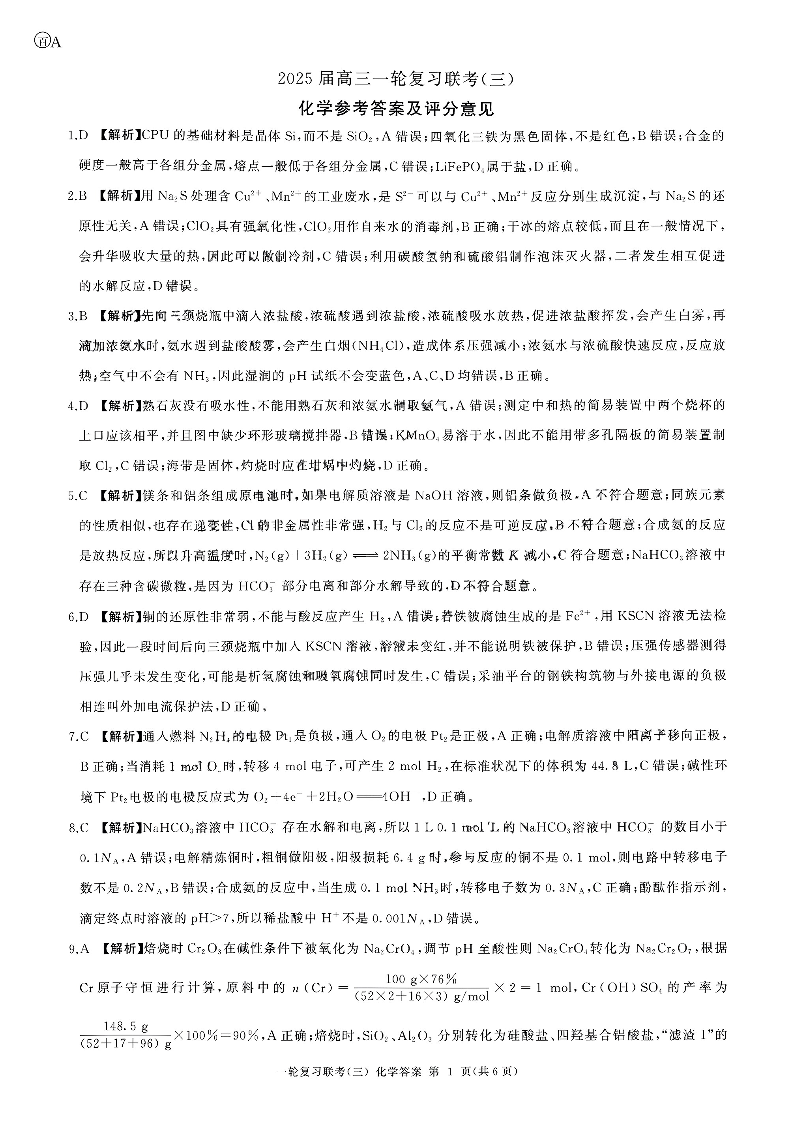 福建省部分学校2025 届高三一轮复习期中联考(三)化学答案