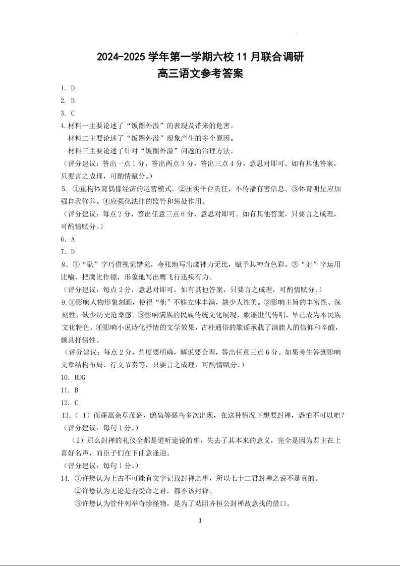 江苏省南京市2024-2025学年第一学期六校11月高三联合调研语文答案
