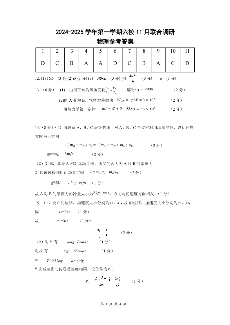江苏省南京市2024-2025学年第一学期六校11月高三联合调研物理答案