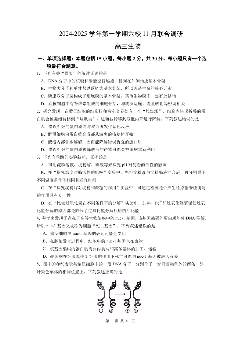 江苏省南京市2024-2025学年第一学期六校11月高三联合调研生物