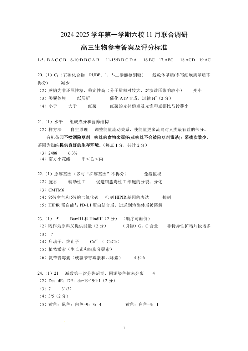江苏省南京市2024-2025学年第一学期六校11月高三联合调研生物答案