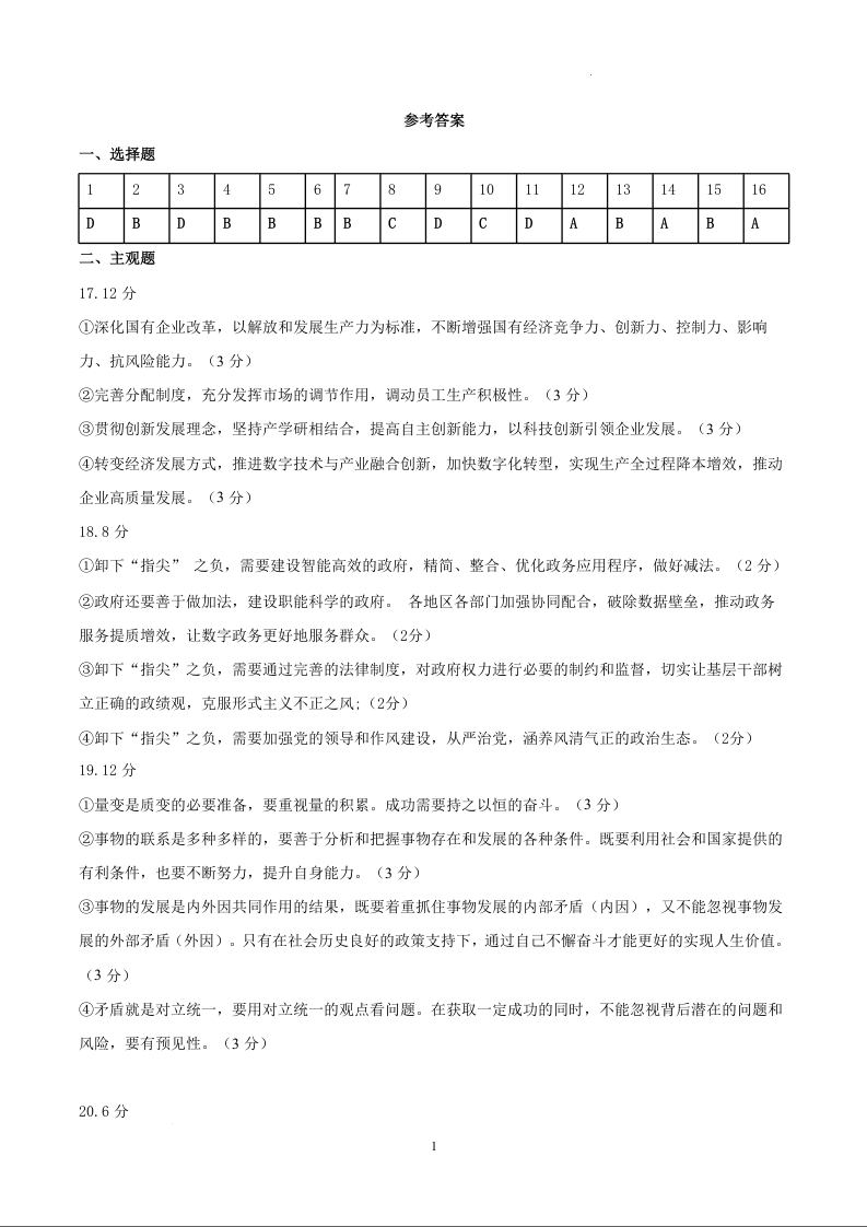 江苏省南京市2024-2025学年第一学期六校11月高三联合调研政治答案