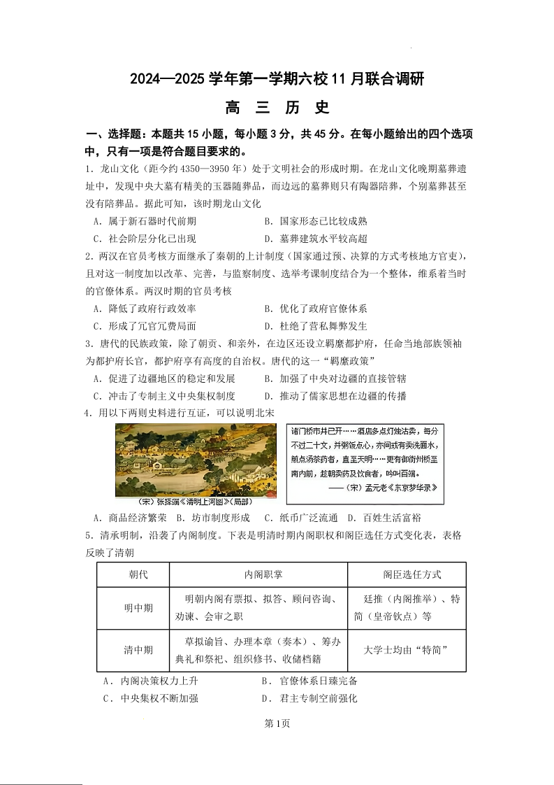 江苏省南京市2024-2025学年第一学期六校11月高三联合调研历史