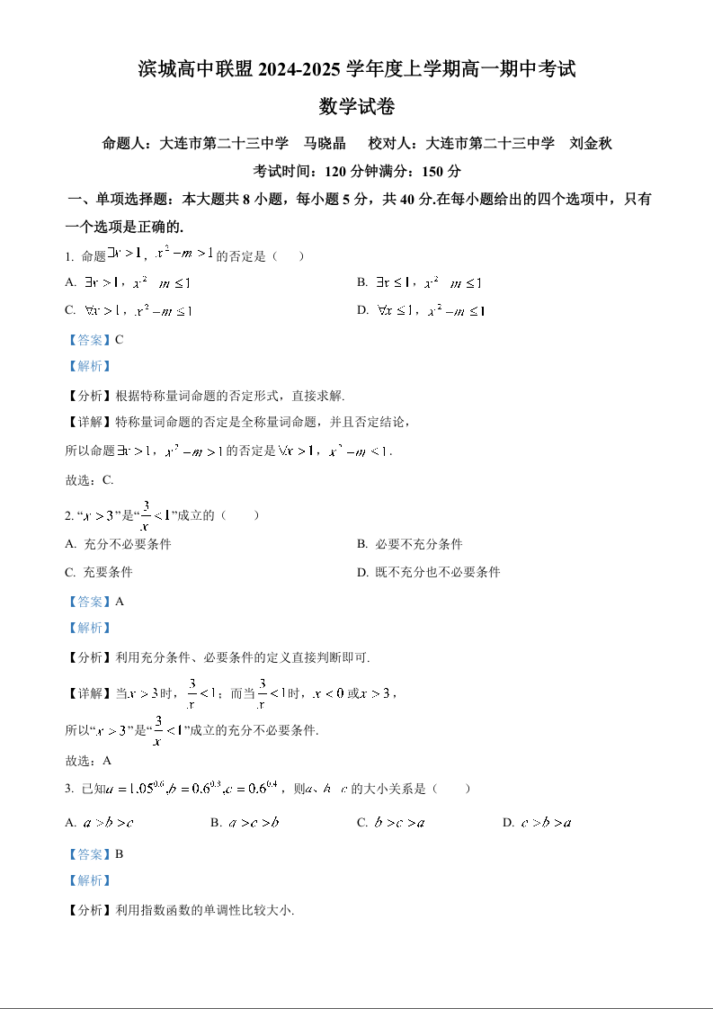 辽宁省大连市滨城高中联盟2024-2025学年高一上学期期中考试数学(精品解析版)