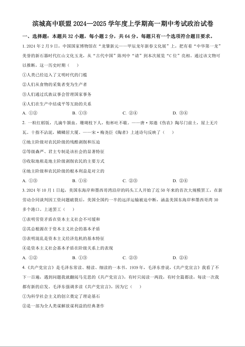 辽宁省大连市滨城高中联盟2024-2025学年高一上学期期中考试政治(原卷版)