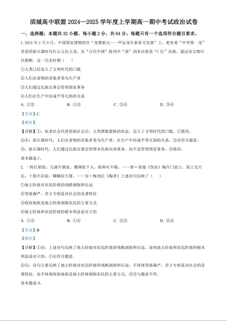 辽宁省大连市滨城高中联盟2024-2025学年高一上学期期中考试政治(精品解析版)