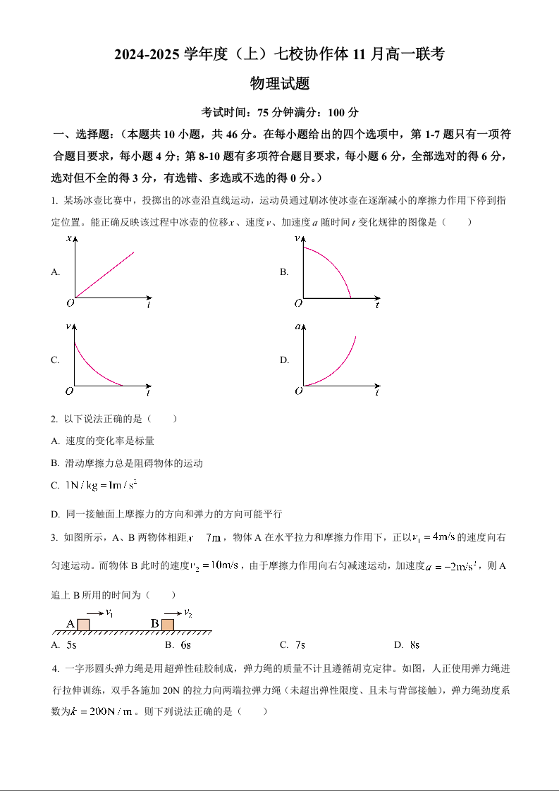 辽宁省丹东市七校协作体2024-2025学年高一上学期11月期中考试物理(原卷版)