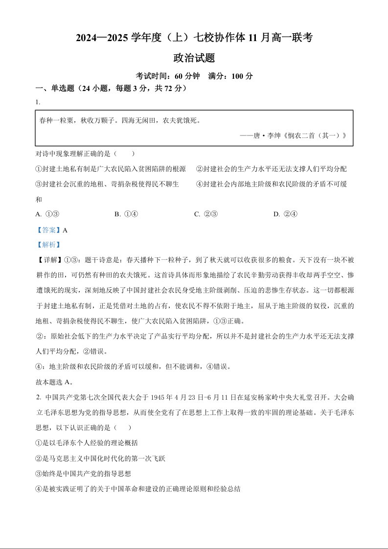 辽宁省丹东市七校协作体2024-2025学年高一上学期11月期中考试政治(精品解析版)