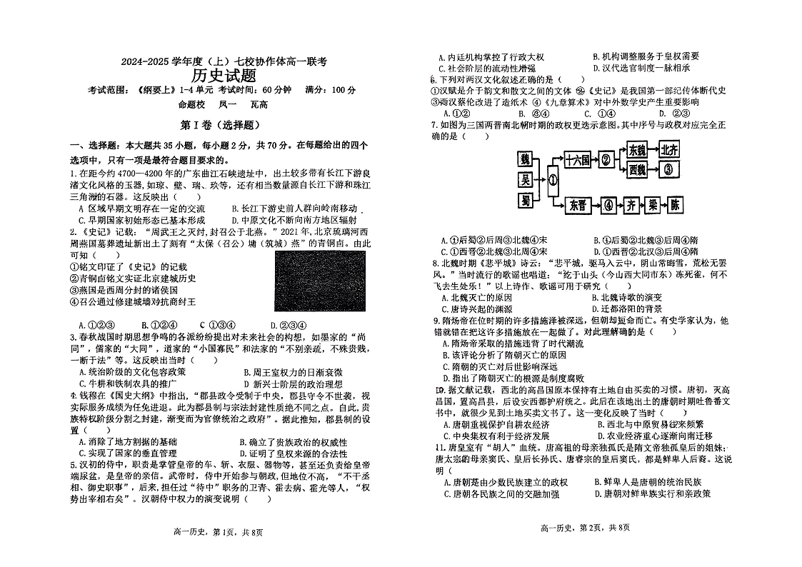 辽宁省丹东市七校协作体2024-2025学年高一上学期11月期中考试历史