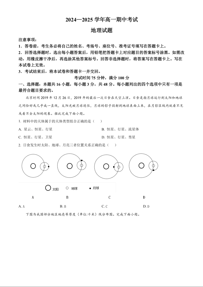 辽宁省锦州市2024-2025学年高一上学期11月期中考试地理(原卷版)
