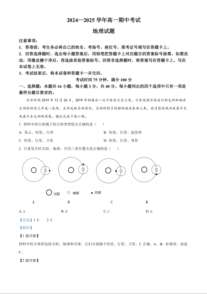 辽宁省锦州市2024-2025学年高一上学期11月期中考试地理(精品解析版)