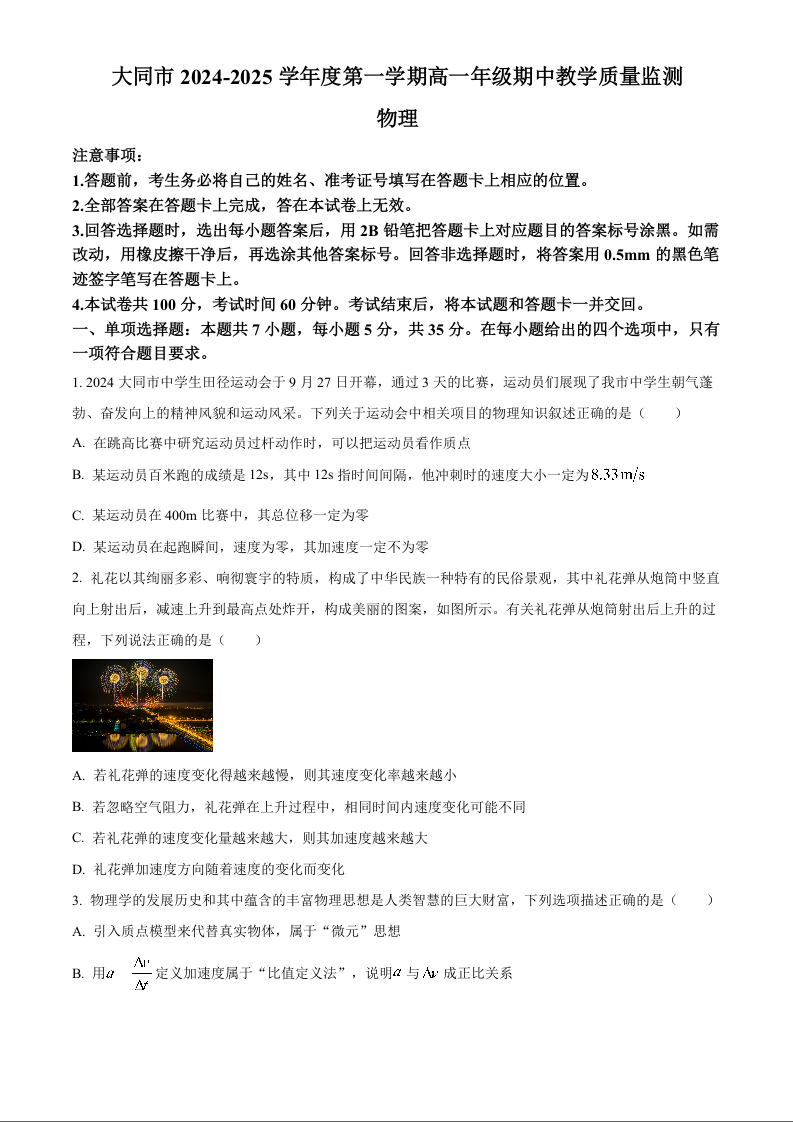 山西省大同市2024-2025学年高一上学期11月期中考试物理(原卷版)