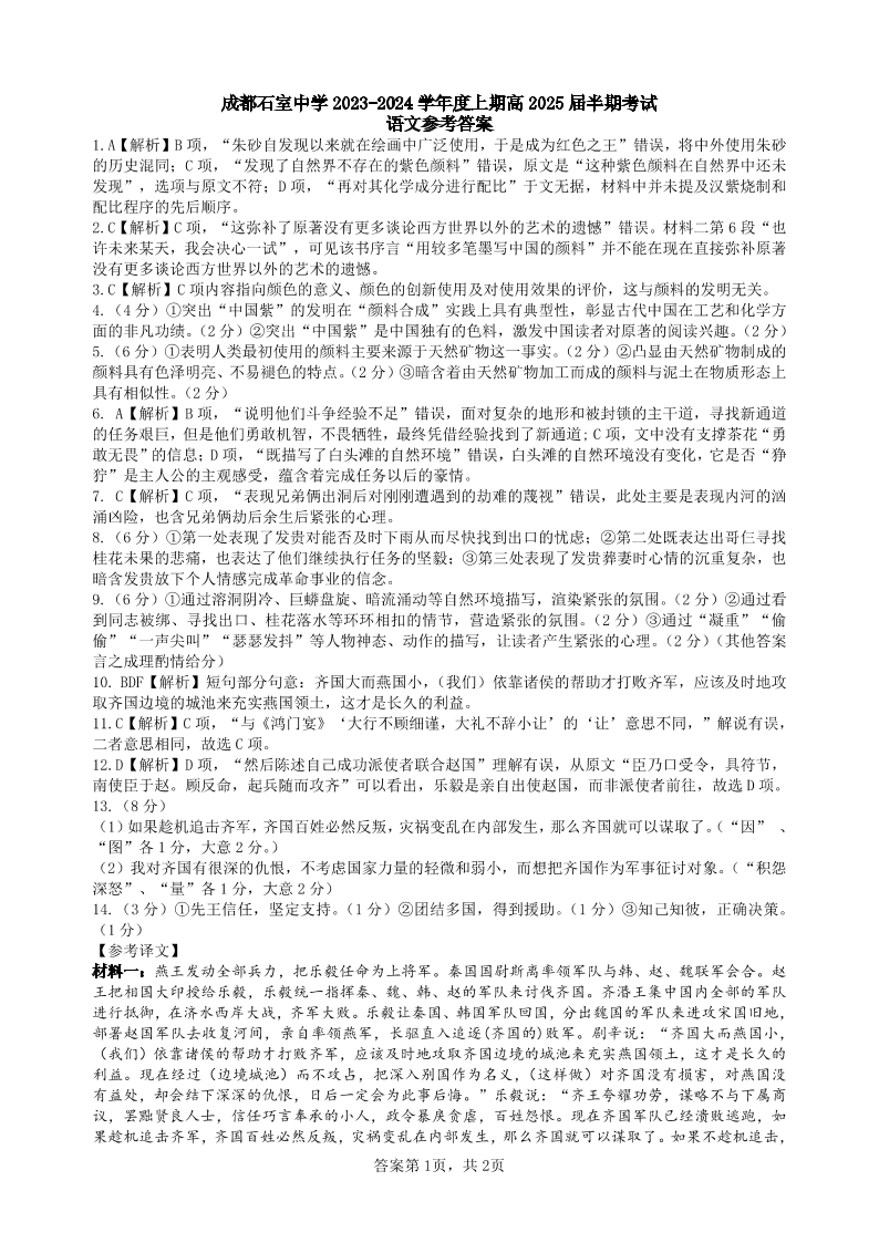 四川省成都市石室中学2024-2025学年高三上学期期中考试语文答案