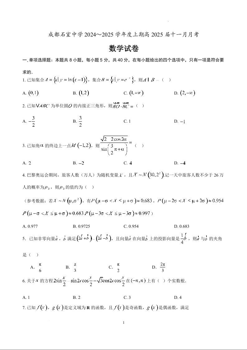 四川省成都市石室中学2024-2025学年高三上学期期中考试数学