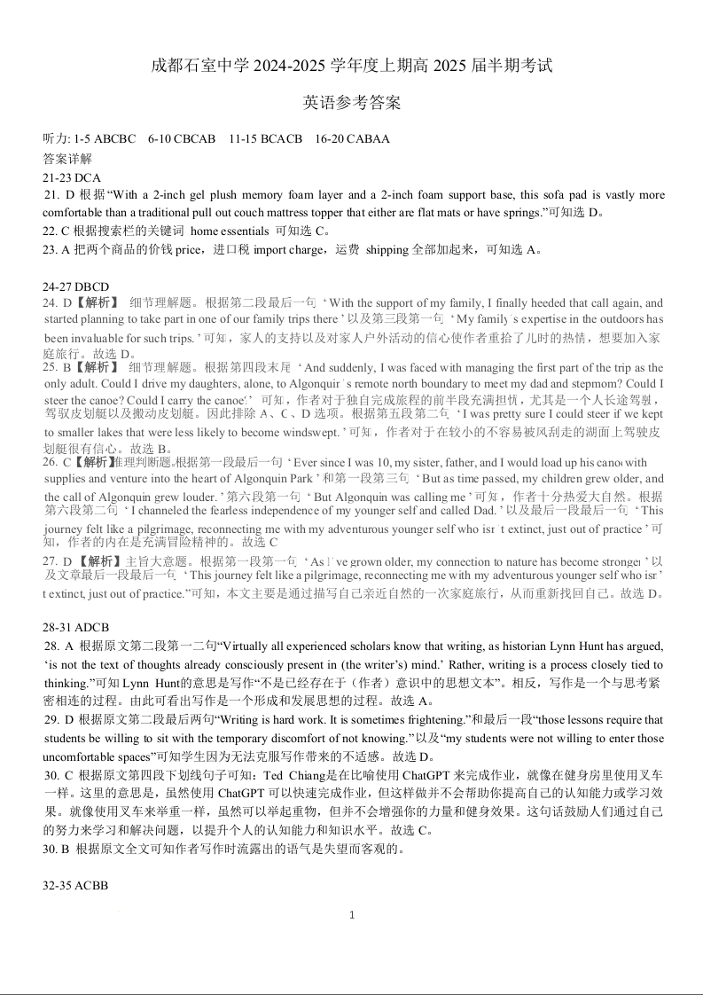 四川省成都市石室中学2024-2025学年高三上学期期中考试英语答案详解