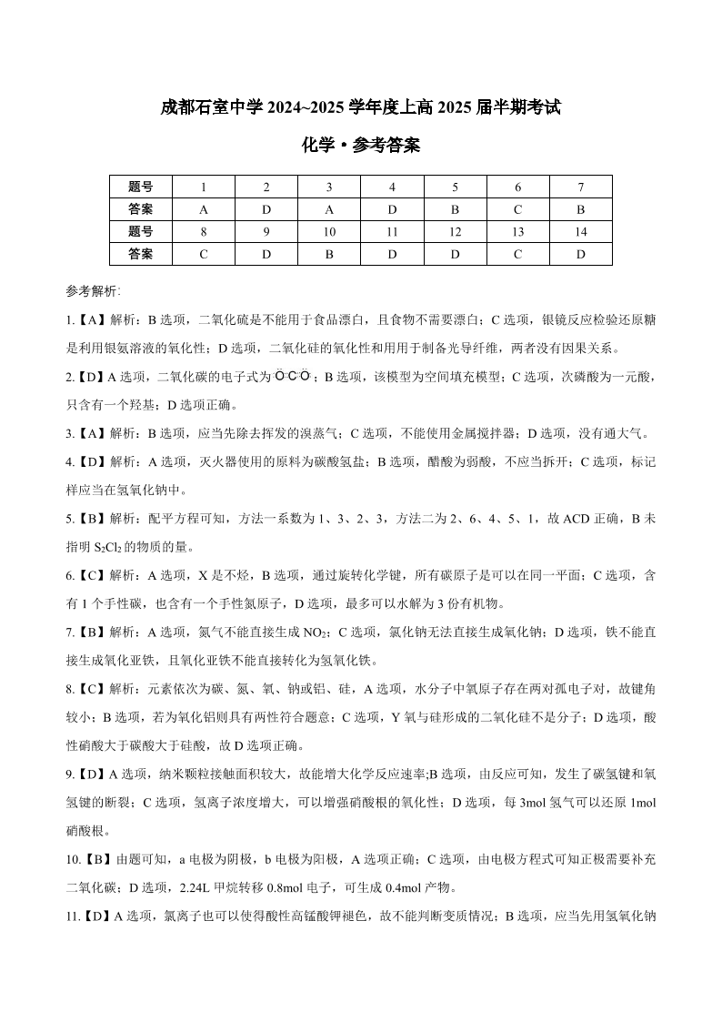 四川省成都市石室中学2024-2025学年高三上学期期中考试化学答案