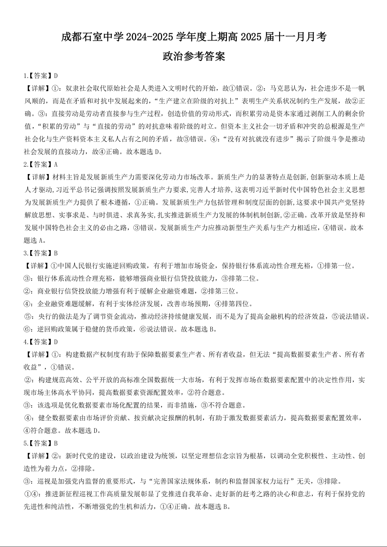 四川省成都市石室中学2024-2025学年高三上学期期中考试政治答案