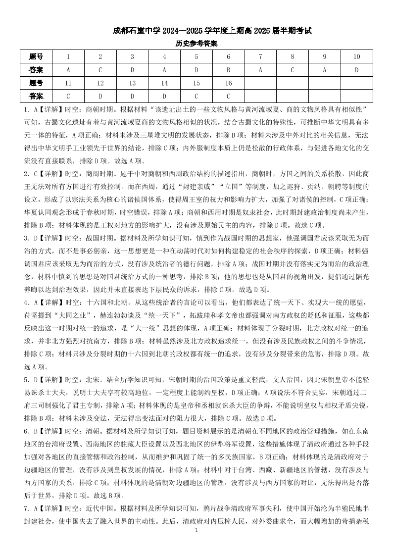 四川省成都市石室中学2024-2025学年高三上学期期中考试历史答案