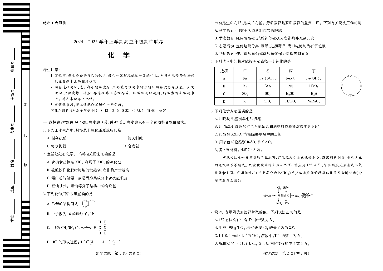 安徽省卓越县中联盟2025届高三11月期中考试化学+答案