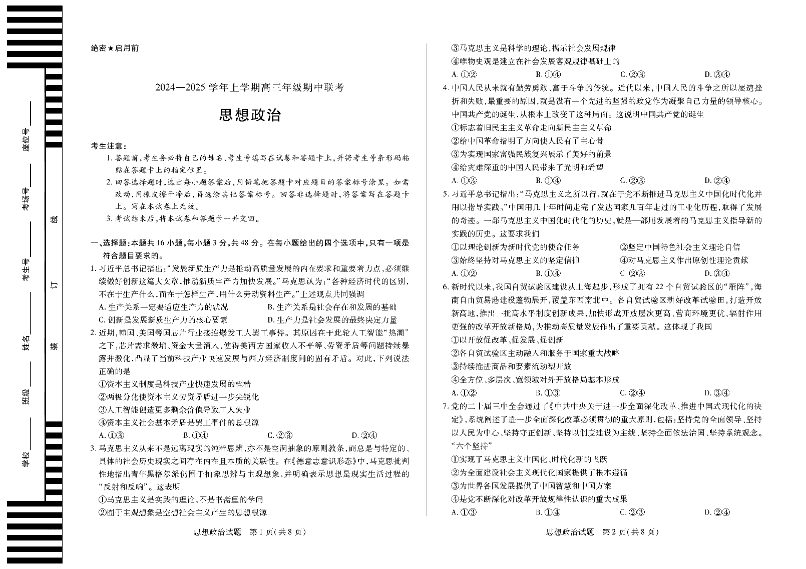 安徽省卓越县中联盟2025届高三11月期中考试政治+答案