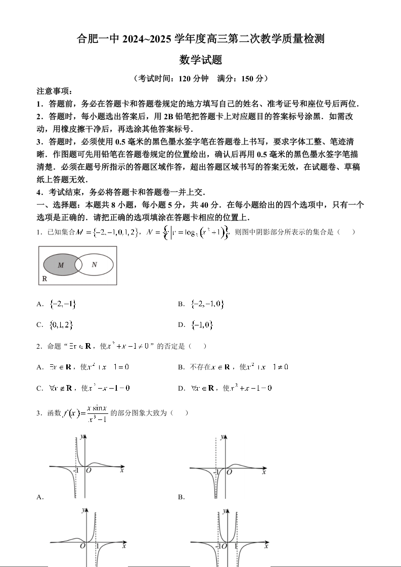 安徽省十联考合肥市一中2025届高三上学期第二次教学检测数学+答案