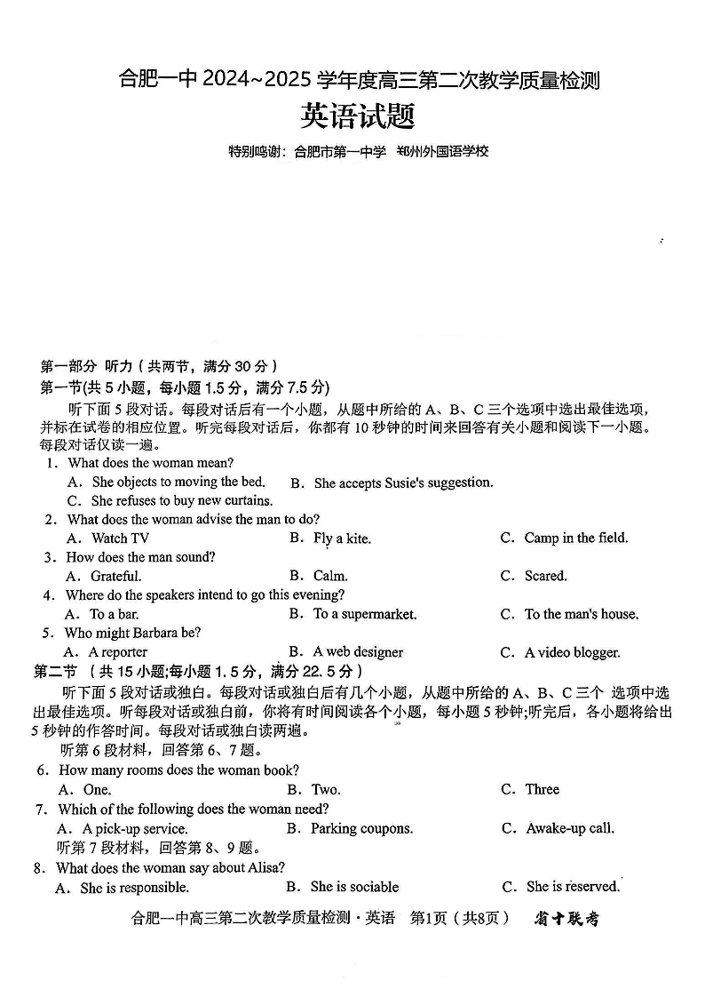 安徽省十联考合肥市一中2025届高三上学期第二次教学检测英语