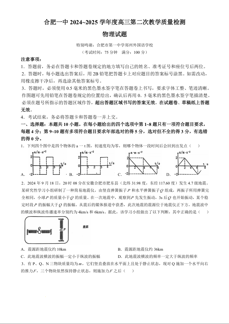 安徽省十联考合肥市一中2025届高三上学期第二次教学检测物理+答案