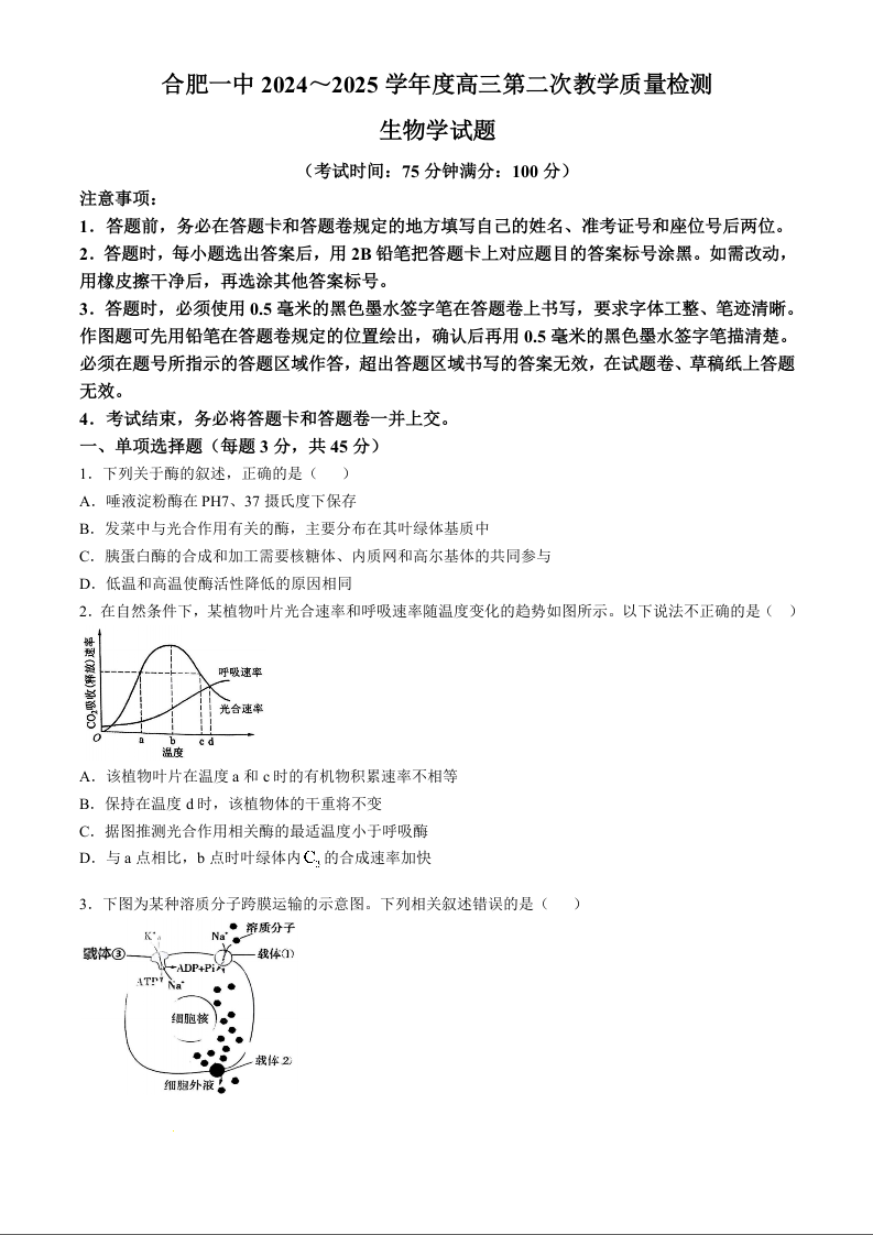 安徽省十联考合肥市一中2025届高三上学期第二次教学检测生物