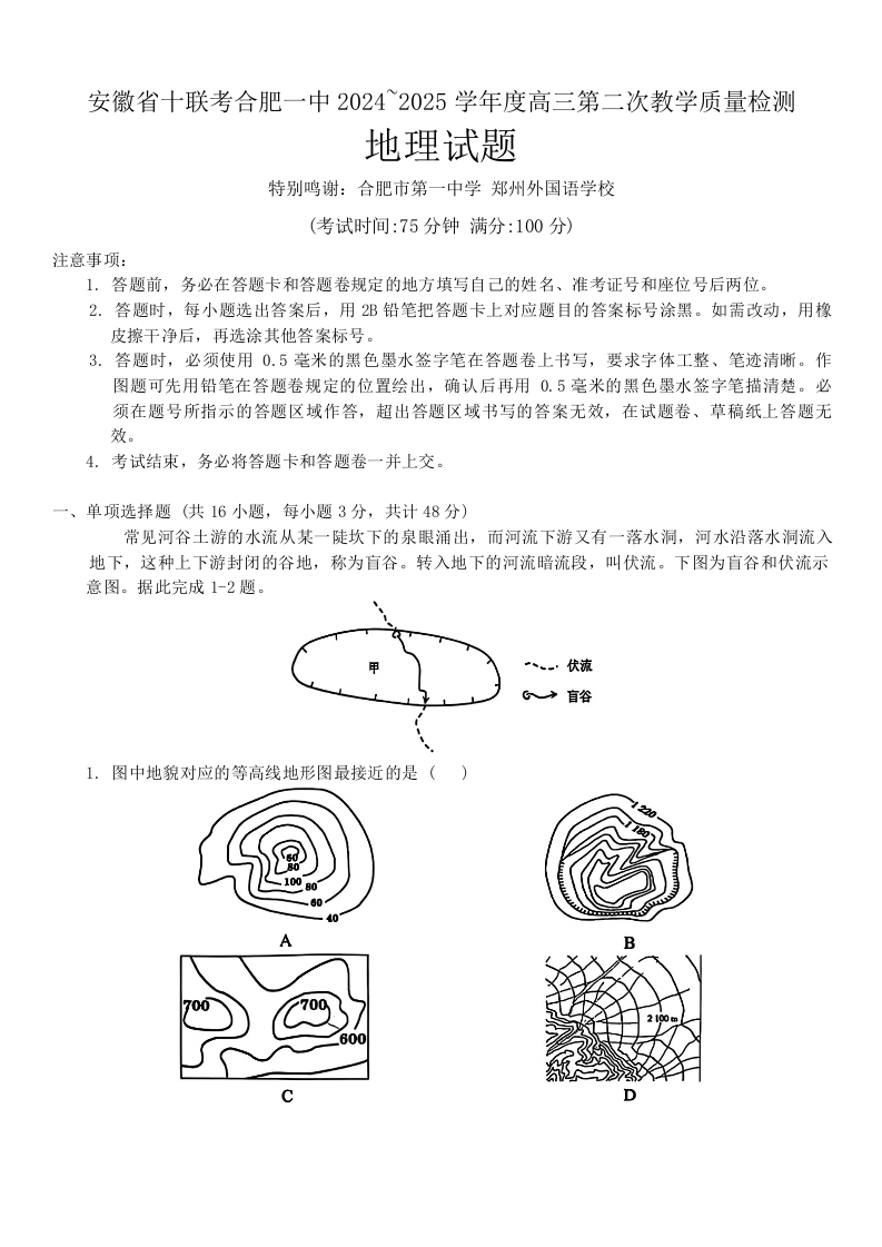 安徽省十联考合肥市一中2025届高三上学期第二次教学检测地理+答案