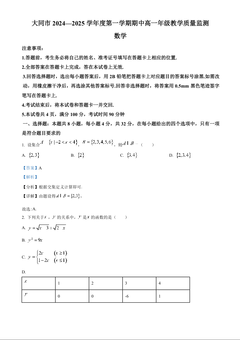 山西省大同市2024-2025学年高一上学期11月期中考试数学(精品解析版)