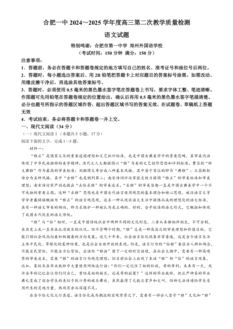 安徽省十联考合肥市第一中学2025届高三上学期第二次教学检测语文+答案