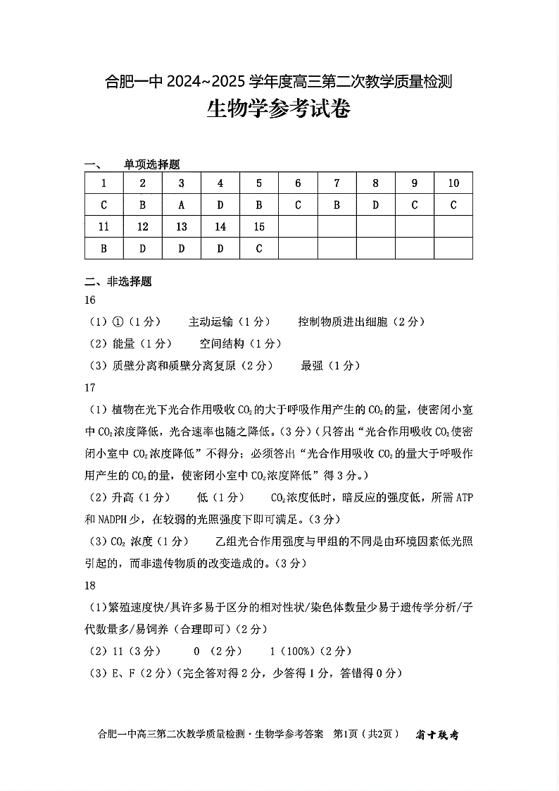 安徽省十联考合肥市第一中学2025届高三上学期第二次教学检测生物答案