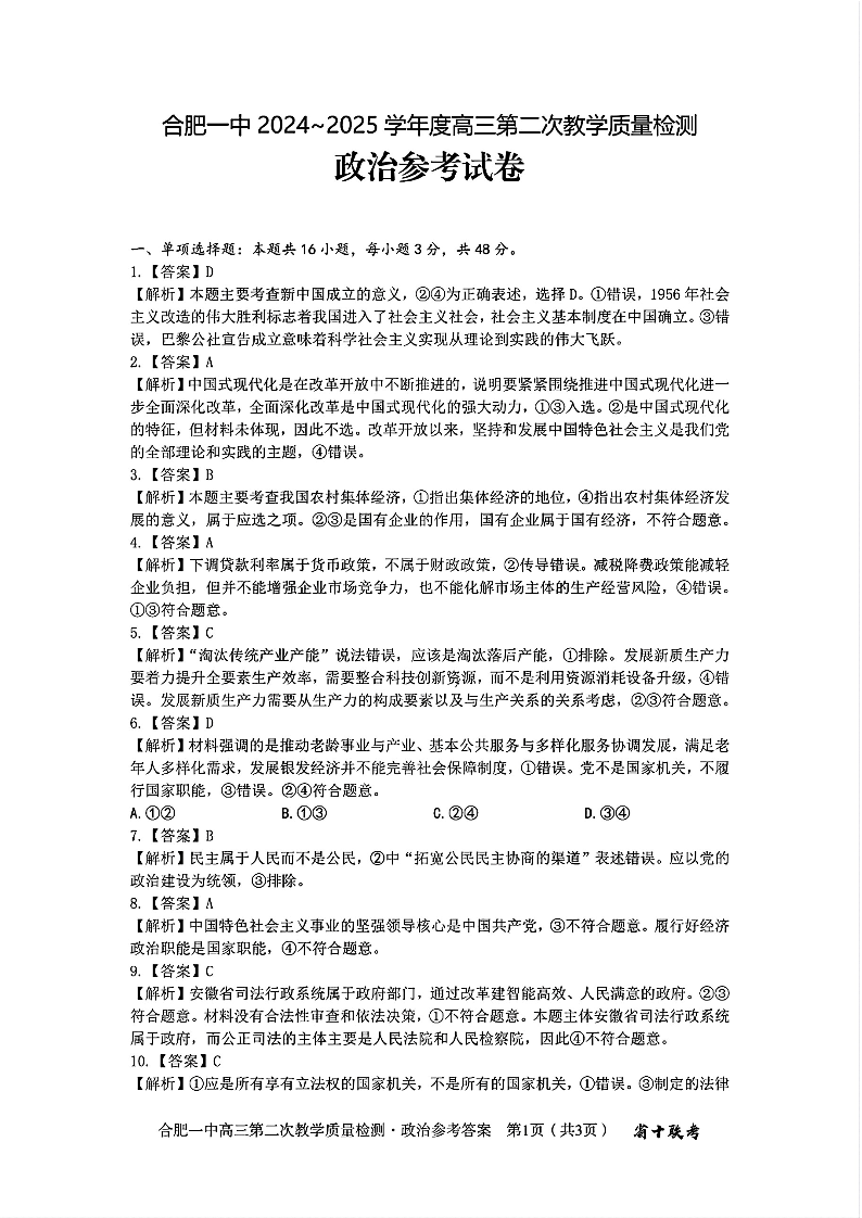 安徽省十联考合肥市第一中学2025届高三上学期第二次教学检测政治答案