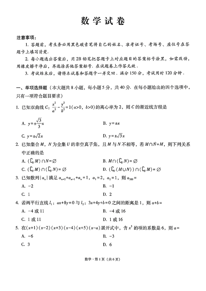 云南师范大学附属中学2025届高三高考适应性月考卷(六)数学+答案