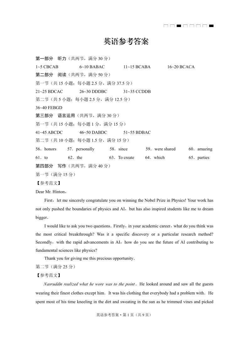 云南师范大学附属中学2025届高三高考适应性月考卷(六)英语答案
