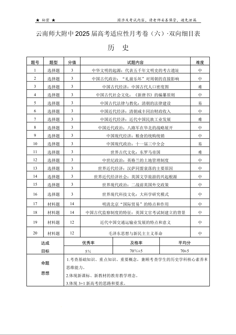 云南师范大学附属中学2025届高三高考适应性月考卷(六)历史-双向细目表