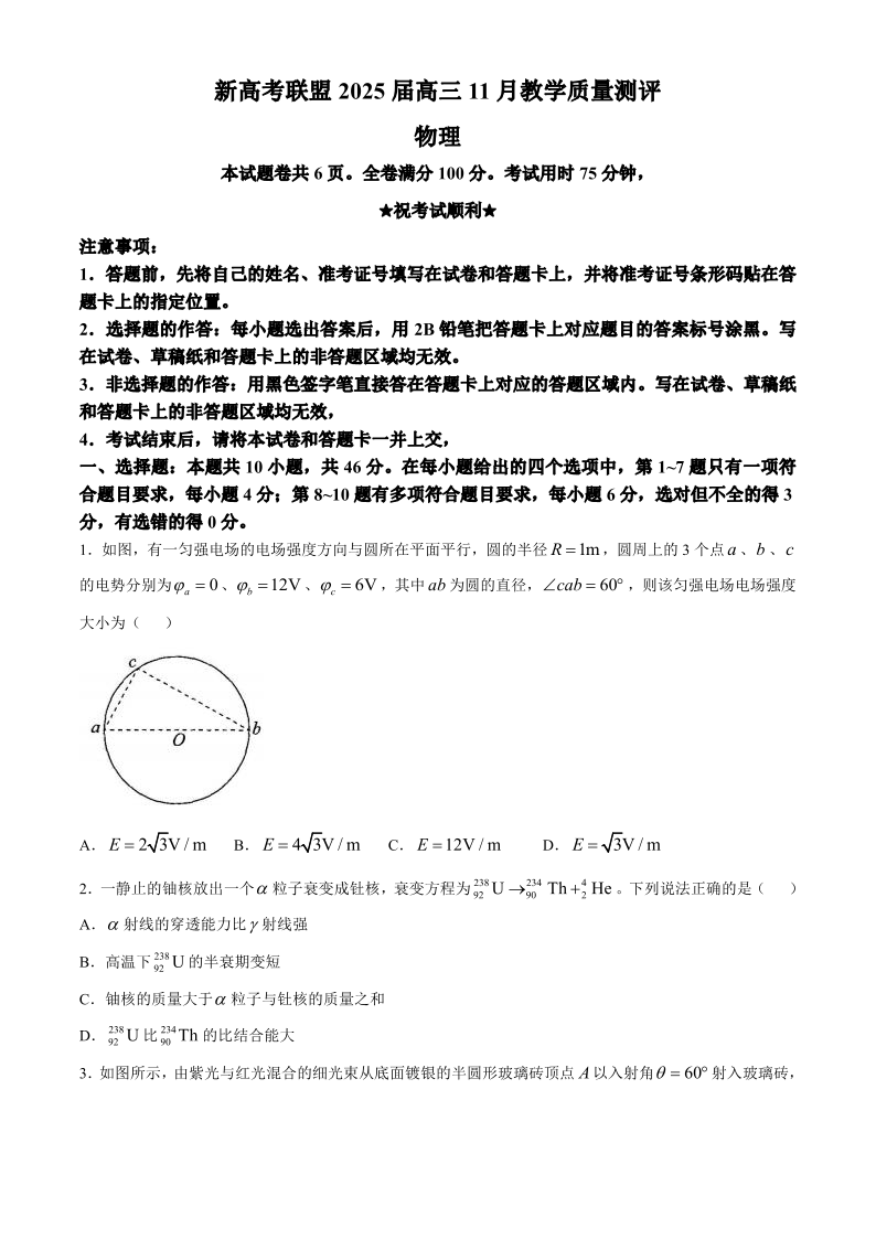 湖北省华大新高考联盟2025届高三11月教学质量测评物理+答案