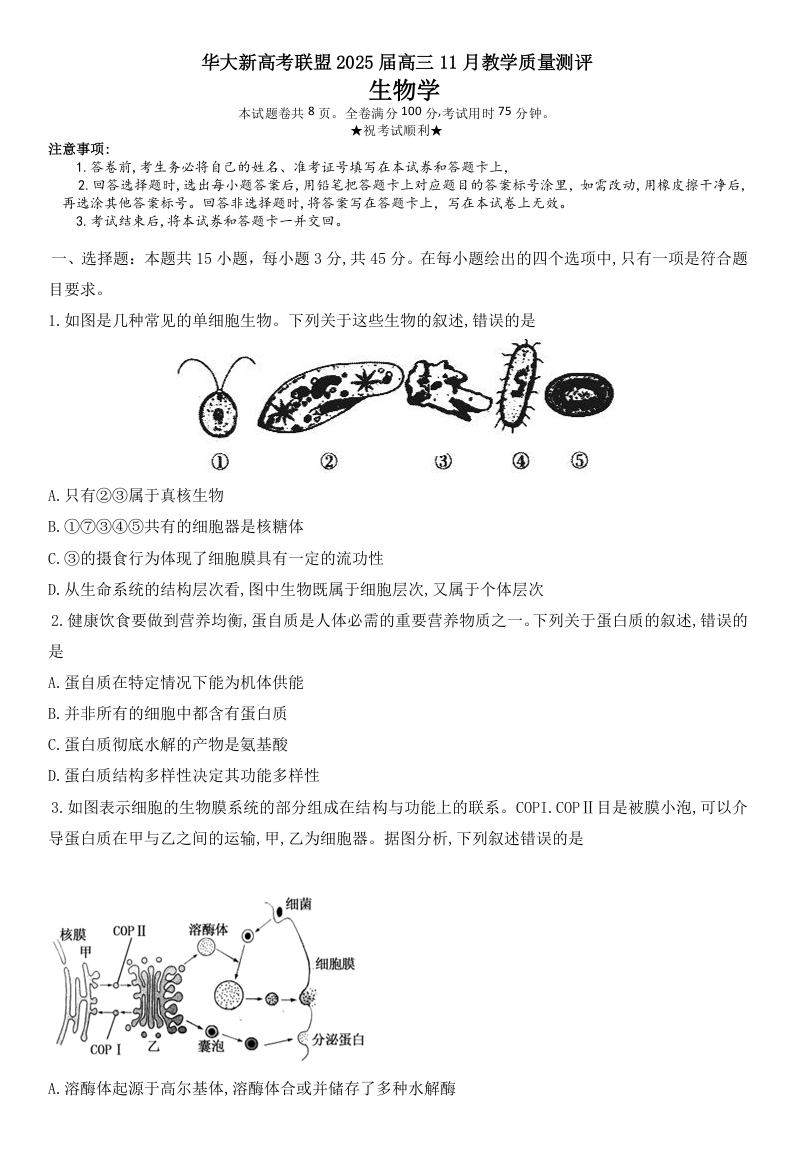 湖北省华大新高考联盟2025届高三11月教学质量测评生物
