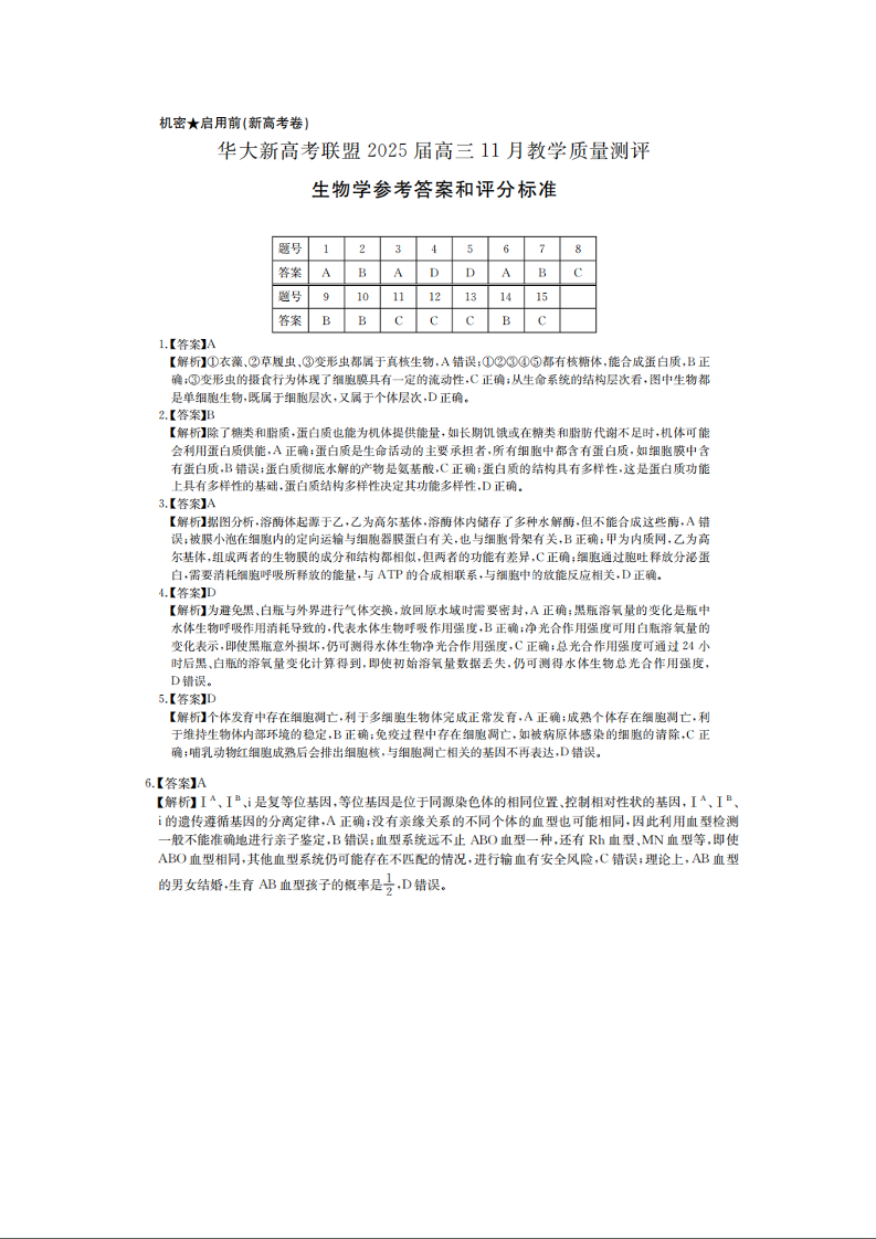 湖北省华大新高考联盟2025届高三11月教学质量测评生物答案