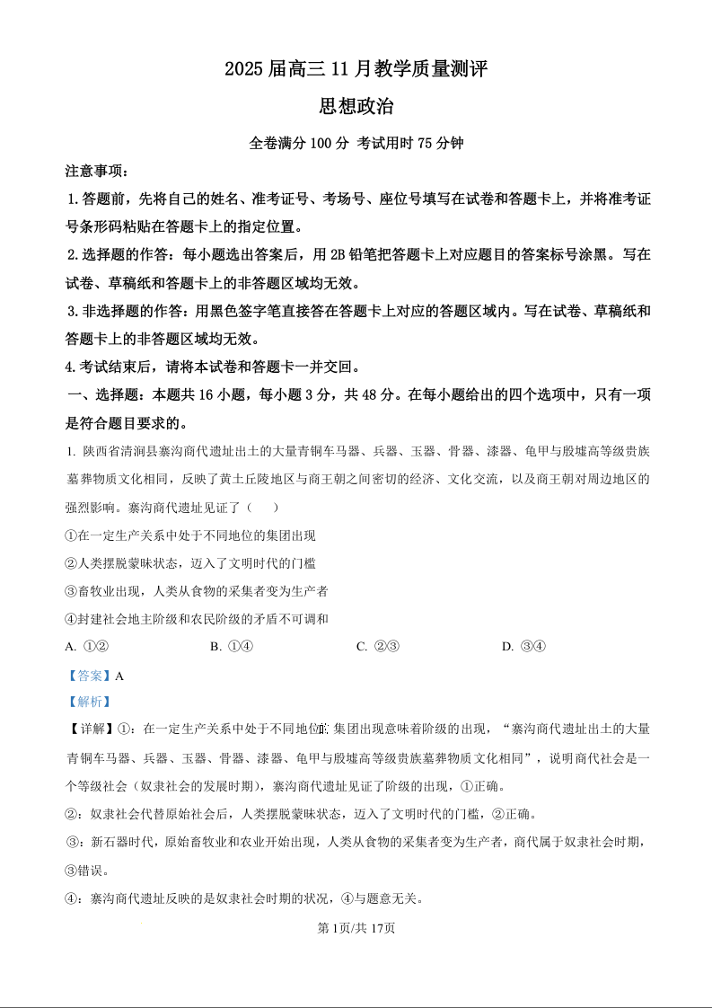 湖北省华大新高考联盟2025届高三11月教学质量测评政治(精品解析版)