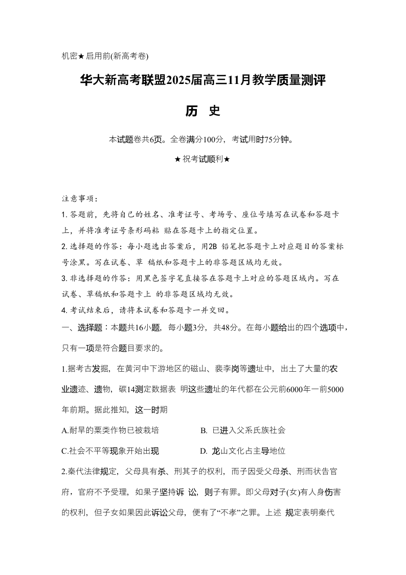 湖北省华大新高考联盟2025届高三11月教学质量测评历史