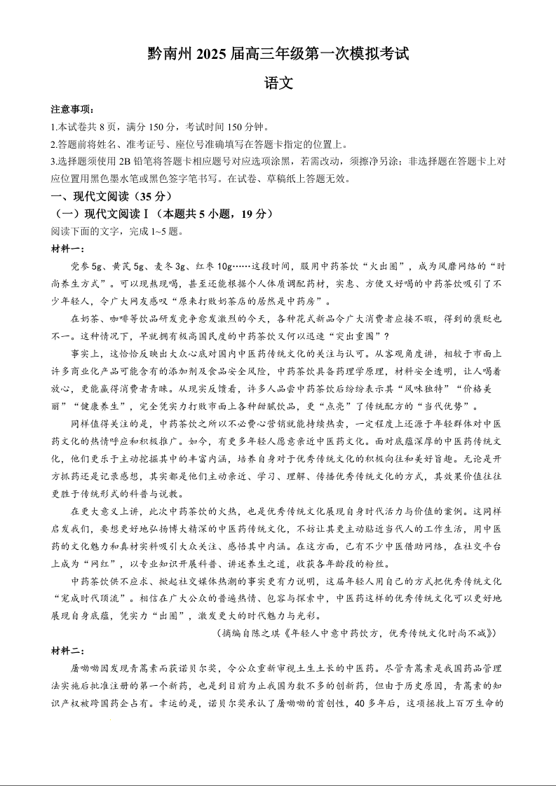 贵州省黔南州2025届高三年级第一次模拟考试语文