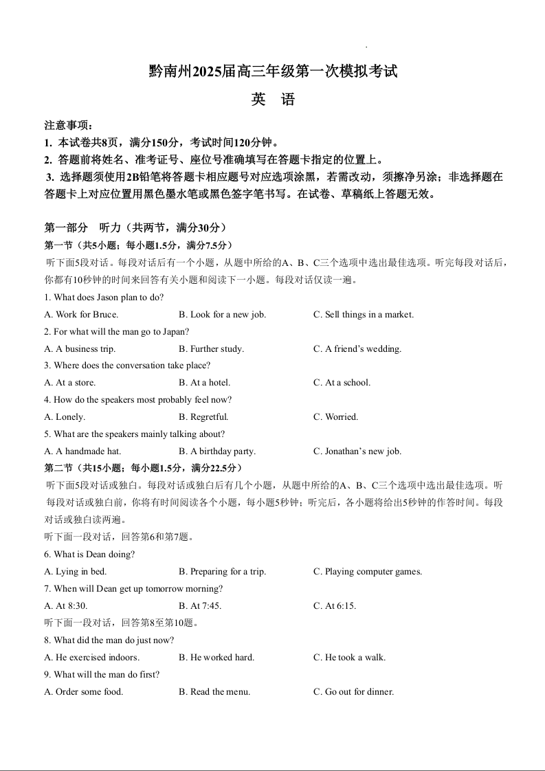 贵州省黔南州2025届高三年级第一次模拟考试英语+答案